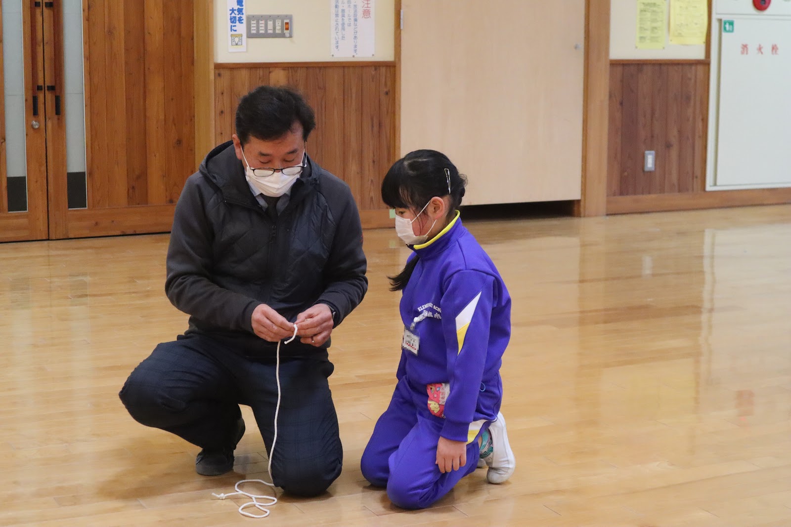 校長先生にひもの巻き方や回し方のコツを教わりながら、なんとか回せた子もいます。